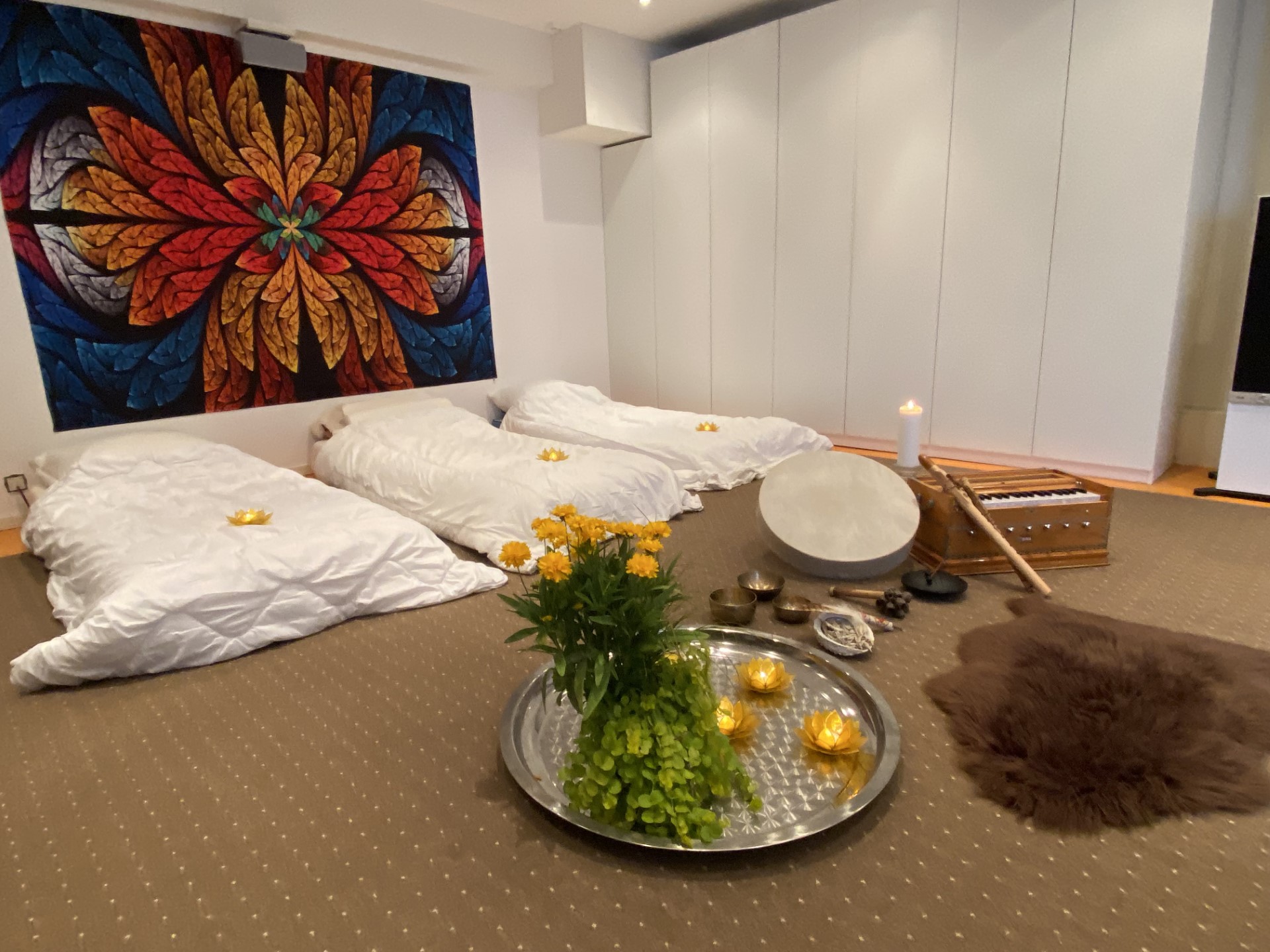 The retreat takes place in a room with a pleasant and calm atmosphere. Before the ceremony begins, we will welcome you in our Farm House. While enjoying a cup of tea, we start with a small introduction round. Afterwards there is room to ask questions and change clothes if you like.